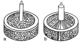 16 pav. Paprasčiausias stiebo įtvirtinimas: a - įkastas, b - įkastas ir apmūrytas